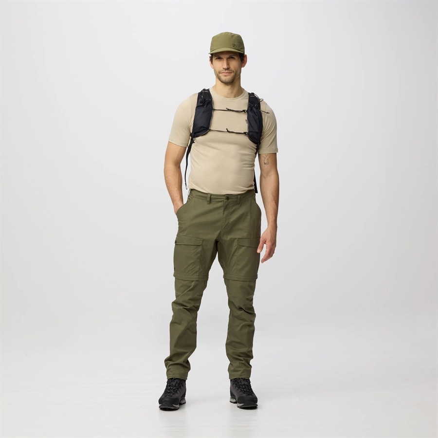 Abisko Hydrid Trailbukser til mænd fra Fjällräven er et par lette og velventilerede bukser, hvor benene kan lynes af, til vandring under varme forhold.