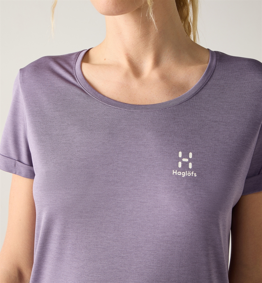 Ridge Hike Tee fra Haglöfs er en letvægts-tee med flot melange effekt - i et feminint snit med rund hals og et lille opsmøg på ærmet.