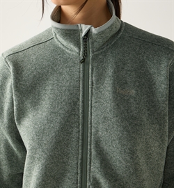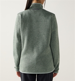 Den er fremstillet af en børstet, grovstrikket melange fleece i 100 % genanvendt polyester med foldede kanter i et ensfarvet, strækbart materiale.