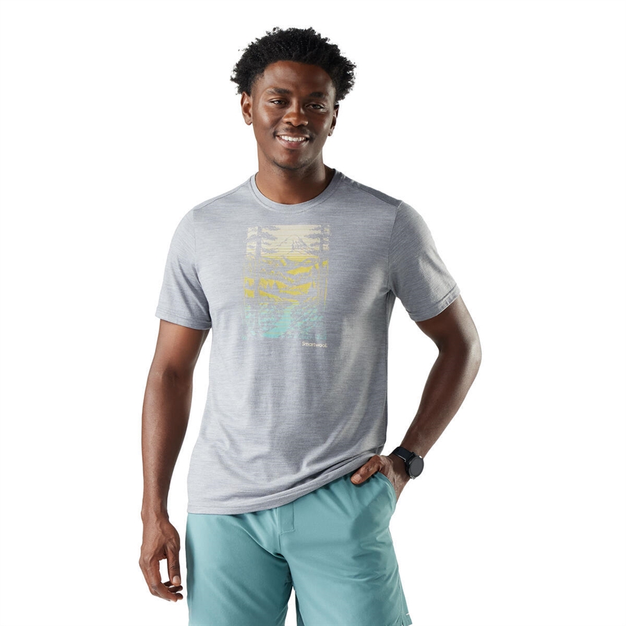 Winding Trail Active Short Sleeve Graphic Tee fra Smartwool er en let kortærmet herre-t-shirt, der er fremstillet i en funktionel blanding af 56% ZQ-certificeret merinould og 44% genanvendt polyester.